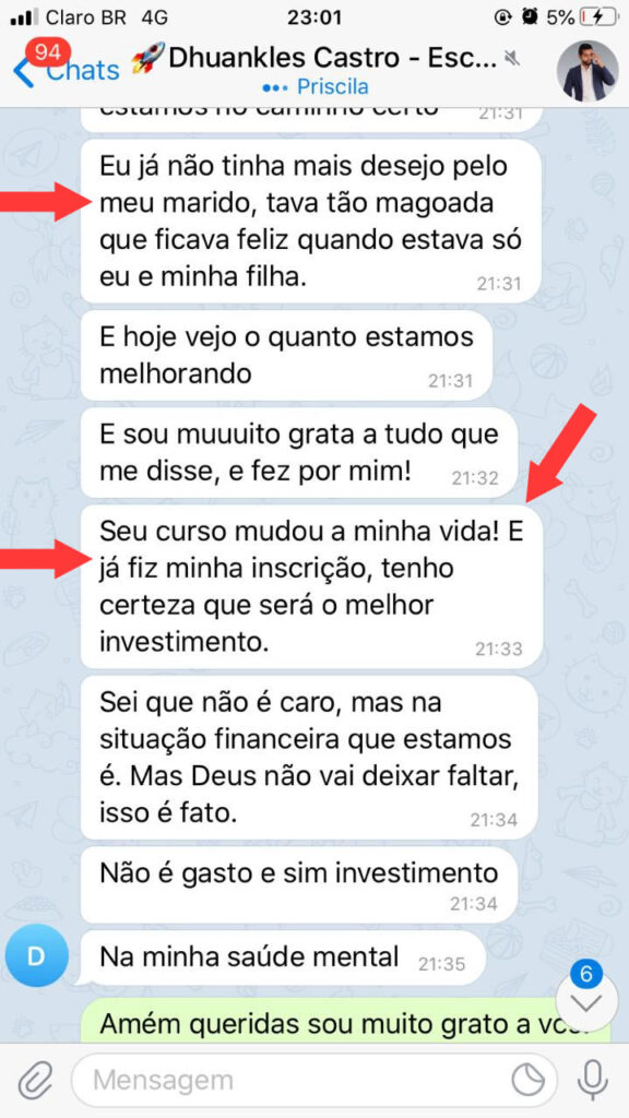 Para garantir que você receba um serviço de atendimento diferente de TUDO que já viu, ao se tornar aluna do 5 dias para salvar seu casamento, você será inserida no grupo secreto do Telegram.